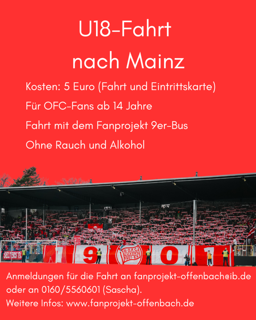 Zum Auswärtsspiel gegen Schott Mainz am 19. April 2026 bieten wir eine U18-Fahrt mit unserem Fanprojekt-Bus (9-Sitzer) an.
